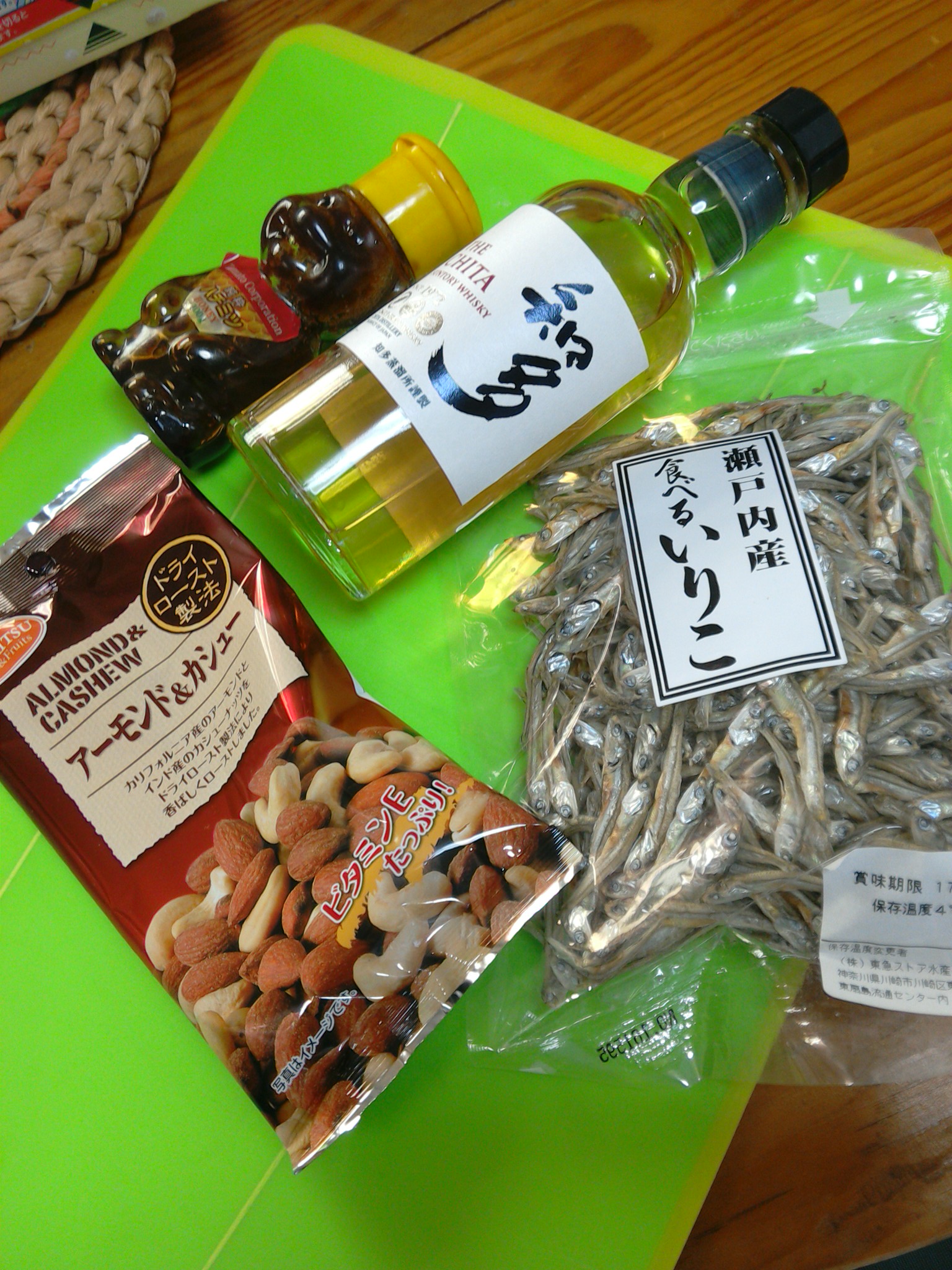 あとは、おつまみのナッツ類。味付けは醤油、バジル、洋酒(ワインとかウィスキーとか香りの強いもの)、蜂蜜です。