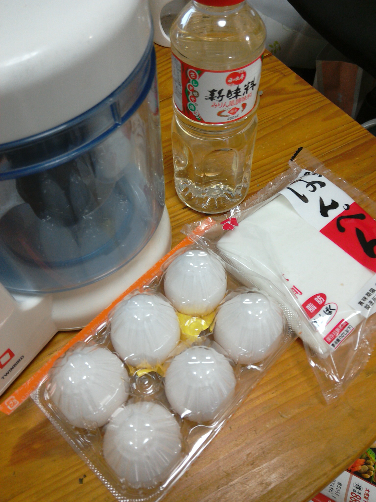 たまご2つ。はんぺん100gの半分。砂糖、大匙1。みりん、大匙3。塩、大匙1