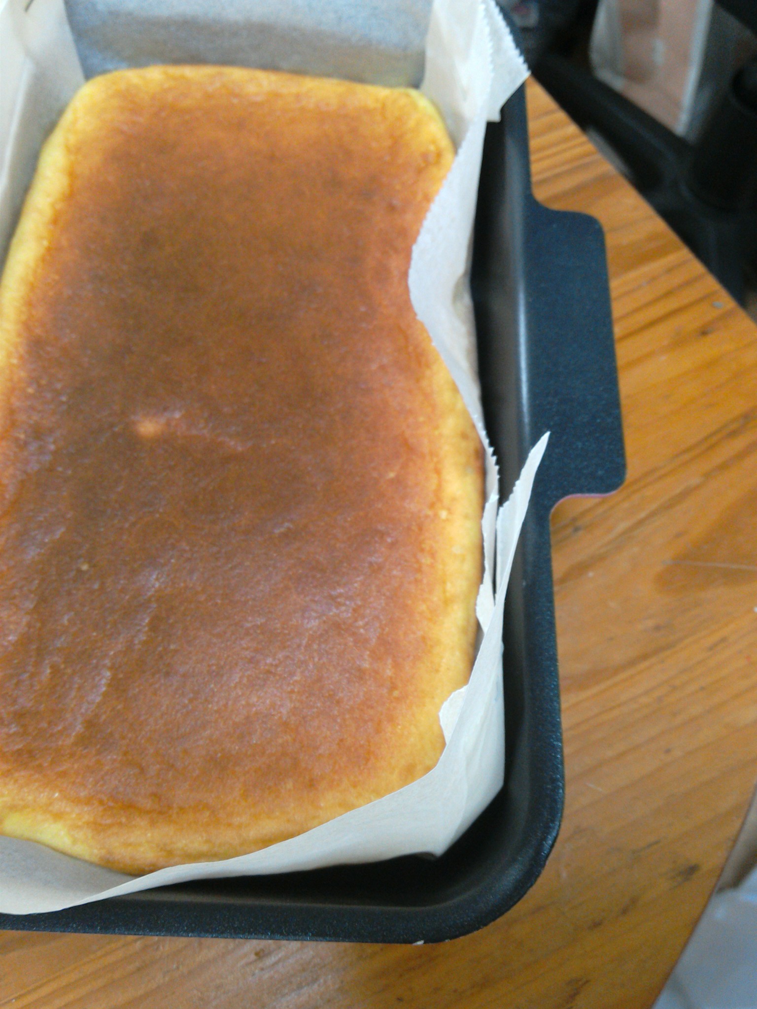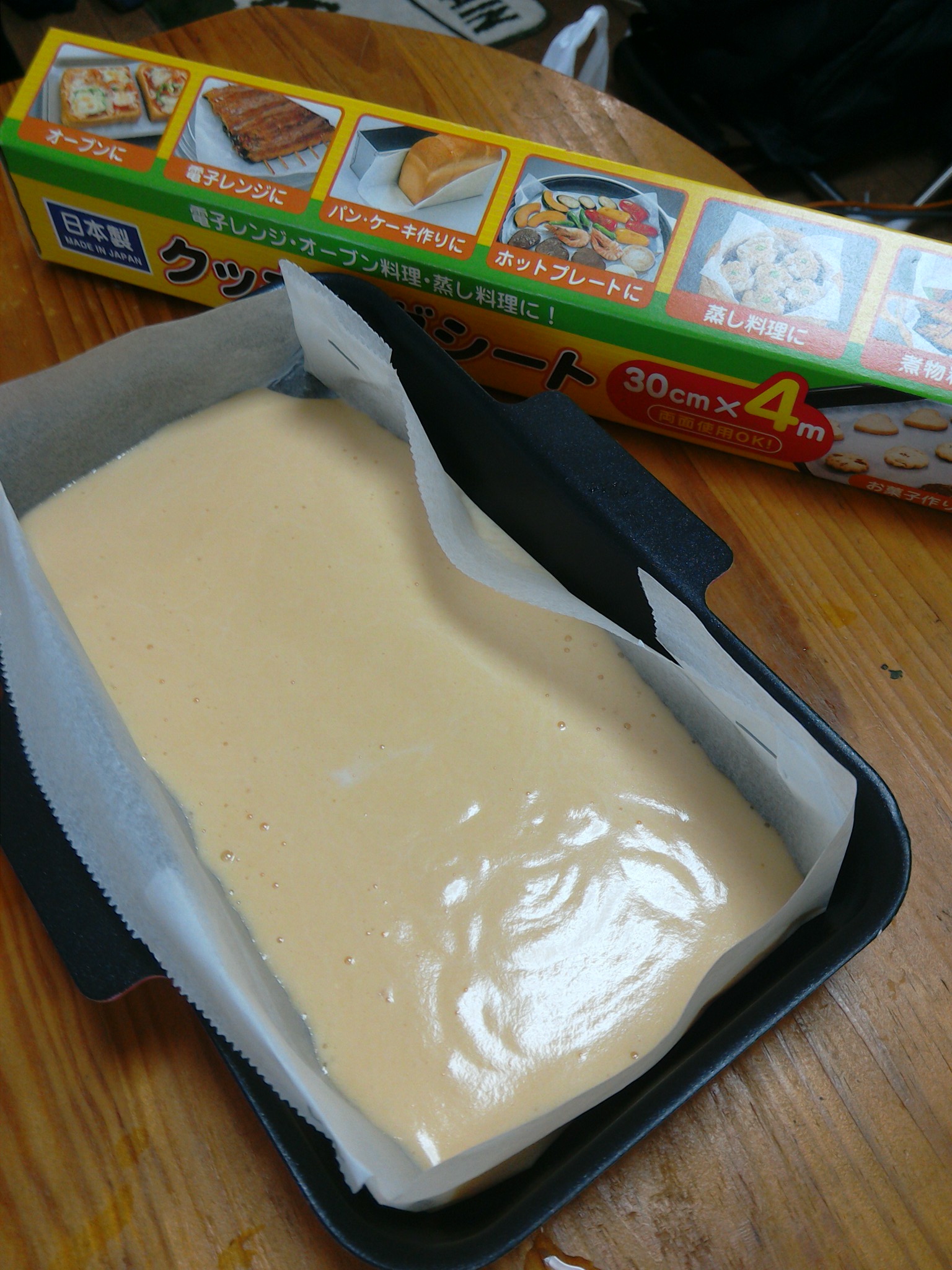 焼きあがったら、まな板の上にラップしいてその上に反対にして乗せます。