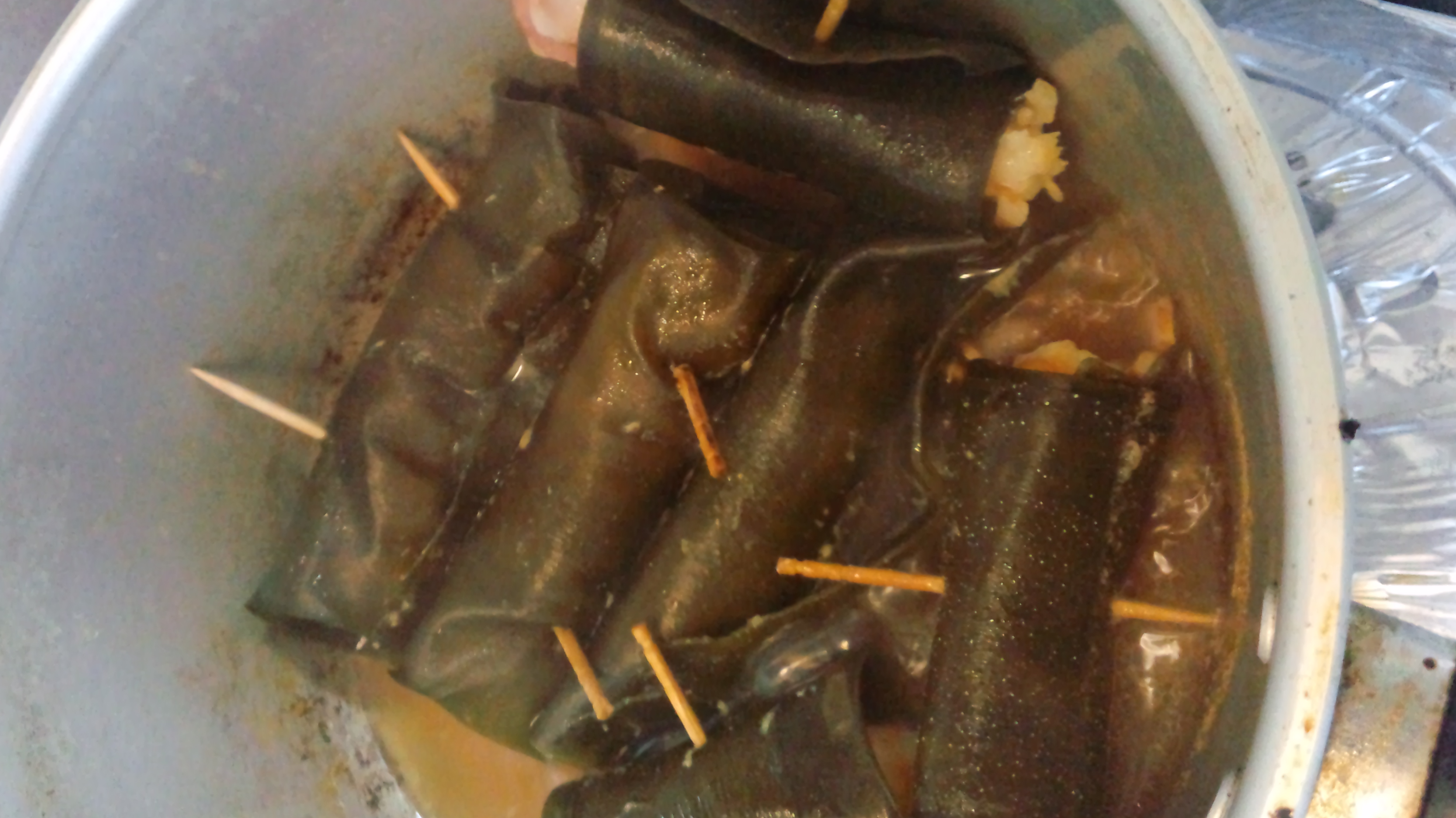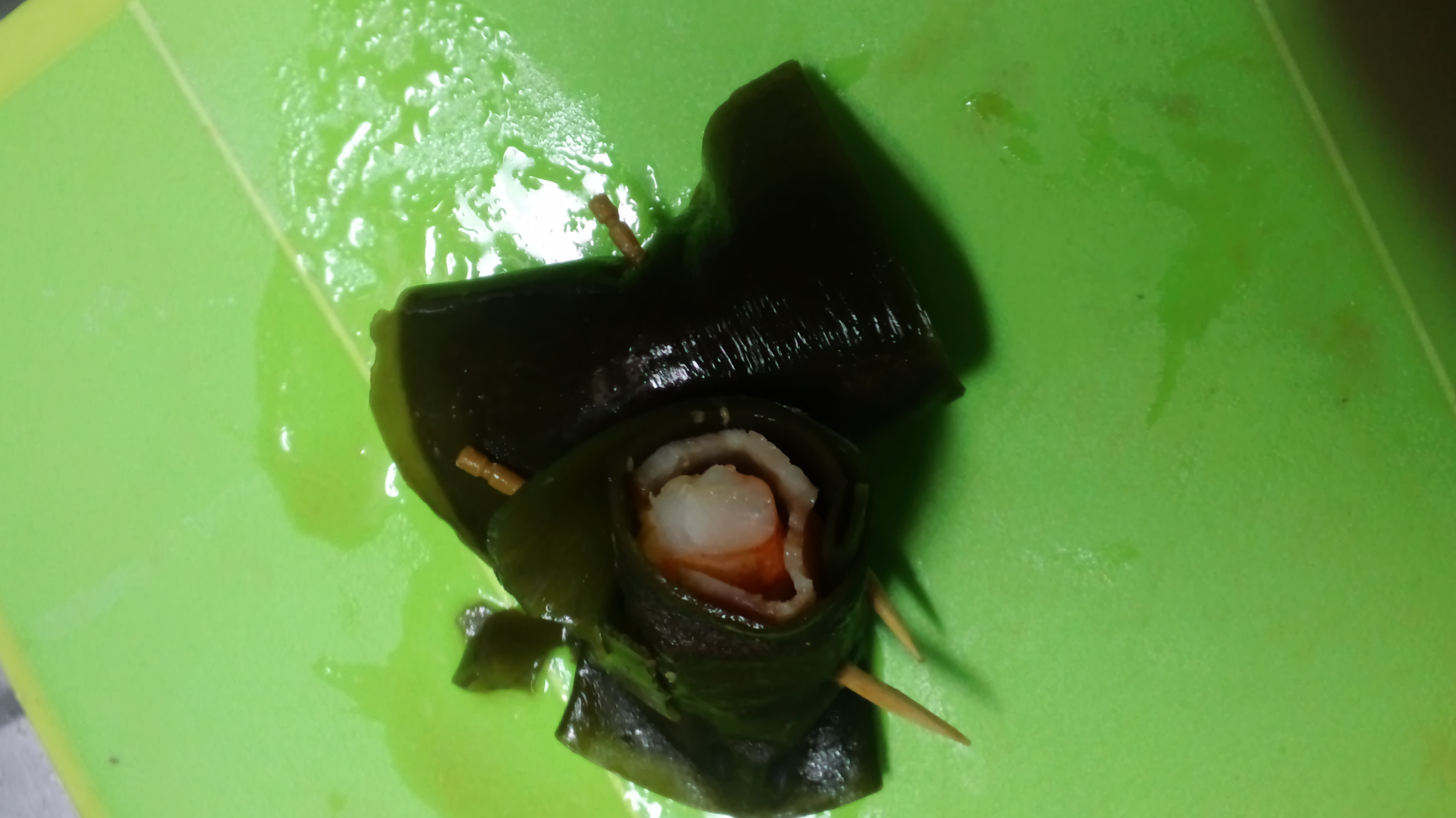昆布にベーコンと海老を巻いていきます。で干瓢はメンドイので楊枝でとめますw